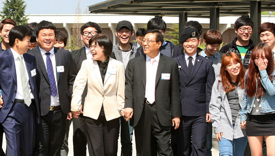 경제금융학부 4학년 정진국(26)씨가 “지방대의 한계를 뛰어넘을 수 있는 조언을 해 달라”고 하자, 옆에 있던 전 전 장관이 “지방대라고 안될 것이란 생각을 버리는 게 시작이다. 산은 넘으라고 있고, 강은 건너라고 있는 것 아니냐”고 말했다. 꽃다발을 전하던 경영학부 정현준(28)씨가 “대기업에 들어가려고 해도, 지방대 출신은 서류전형에서 불리하다”고 하자, 이동건 우리은행 수석부행장은 “회사의 인재상이 무엇인지 살펴서 공략하면 장애물이 되지 않는다”고 조언했다.